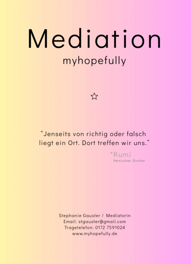 - Mediation mit dem Schwerpunkt Paarbeziehungen, Familien, Freundschaften, Nachbarschaft, etc. – für zwei oder mehrere Konfliktparteien.