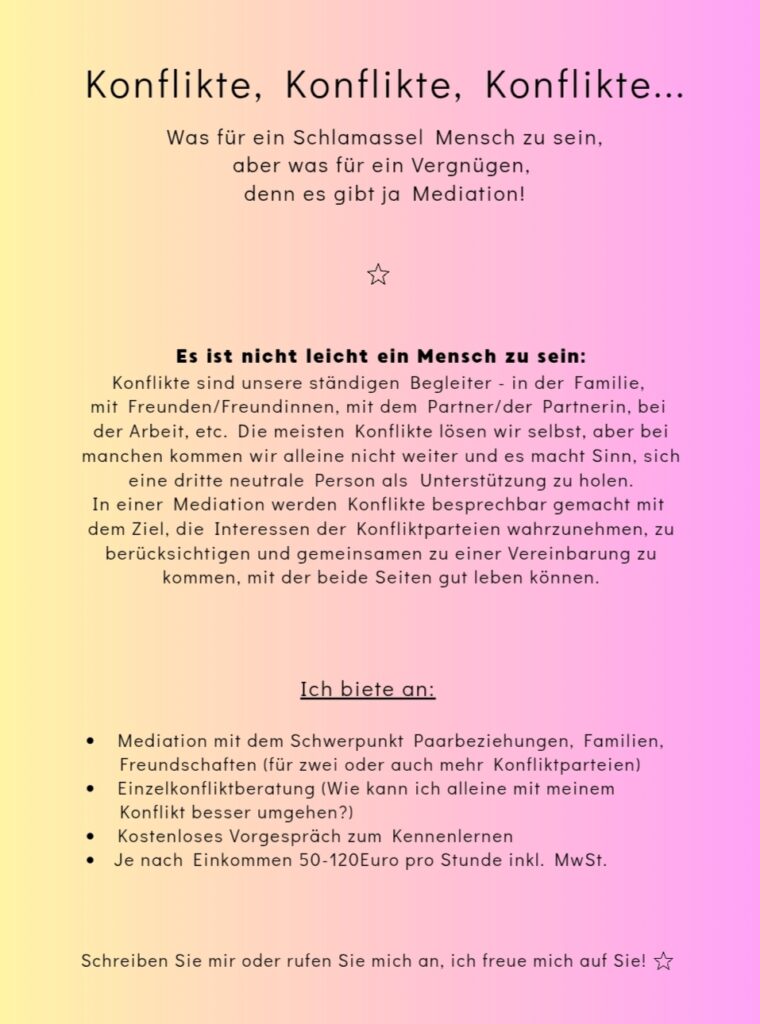 Konflikte stressen uns, machen uns unglücklich, manchmal lähmen sie uns regelrecht, dabei sind sie Anzeiger dafür, dass zwischen den beteiligten Menschen etwas Wichtiges ungeklärt ist und es vielleicht Sinn macht, eine dritte neutrale Person miteinzuschalten, eine Mediatorin, einen Mediator.